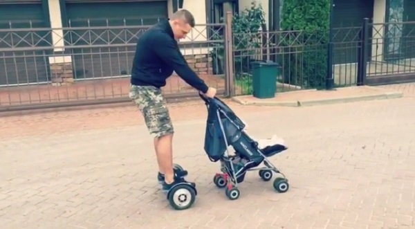 Даже сколько не он развлекает маленькую Теону, а сам себя. Ведь просто гулять с коляской не так интересно, но если к этому процессу подключить актуально изобретение – сигвей, то и прогулки становятся забавными.
