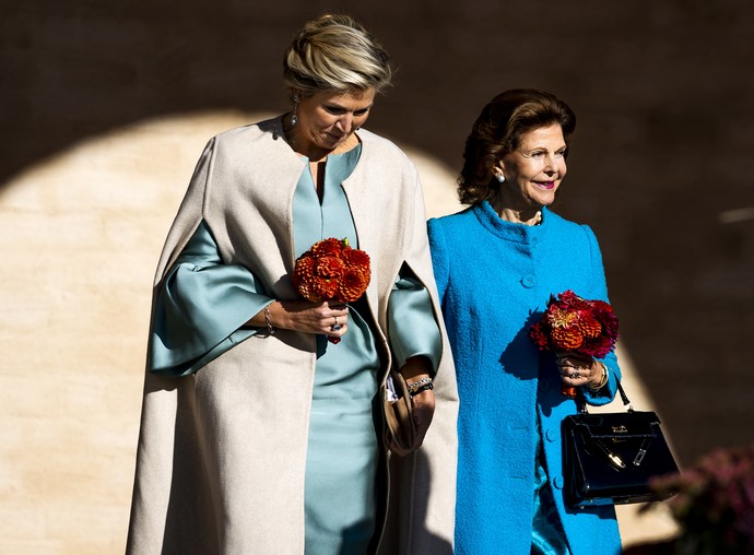 Максима и Сильвия были одеты в дополняющие друг друга оттенки голубого. Королева Нидерландов выбрала металлическое бирюзовое платье, а королева Швеции – более глубокий, океанский синий цвет.