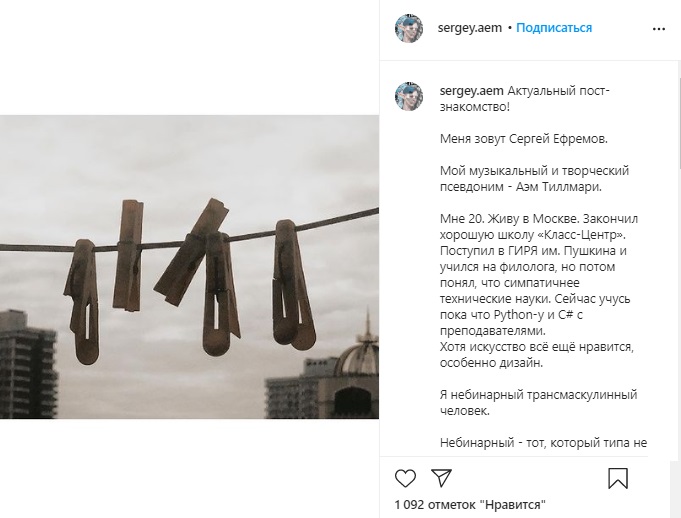 На смену Аэм Тиллмари теперь пришел просто Сережа Ефремов, хотя и от Аэма небинарное трансмаскулинное создание, рожденное в браке Михаила Ефремова и Ксении Качаловой, отказываться пока не собирается.