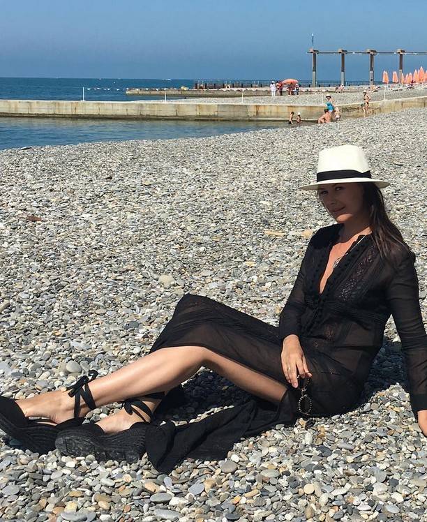 Без пляжной фотосессии не обошлось, но, учитывая статут Федоровой, как дамы серьезной, на снимках мы можем увидеть лишь ножки, которые выглядывают из-под длинного черного платья.
