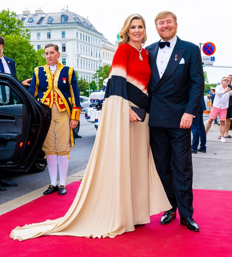 Королева Максима превзошла саму себя, надев длинное платье-накидку в цветах флага Королевства. Государственный символ Нидерландов состоит из трёх горизонтальных полос: верхней — красной, средней — белой, и нижней — синей.
