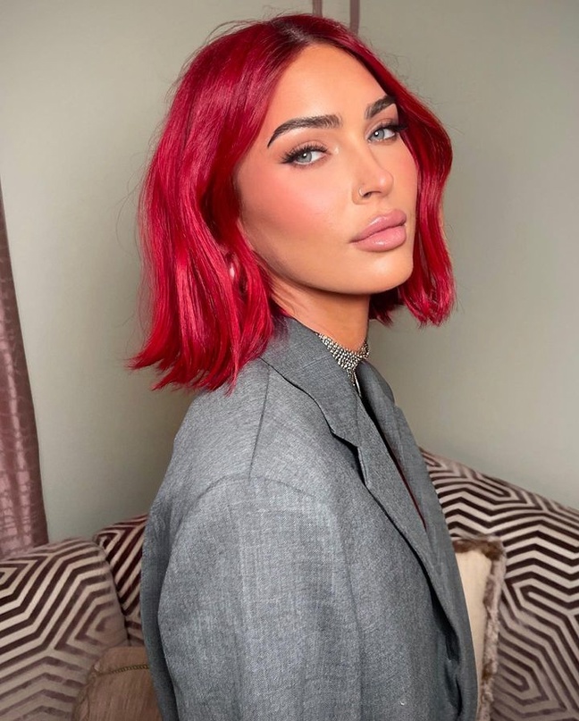 В продолжении новости ещё одна фотосессия Меган Фокс с новым малиново-красно-бордовым цветом волос в пиджаке, который даёт возможность насладиться видом груди многодетной мамы: