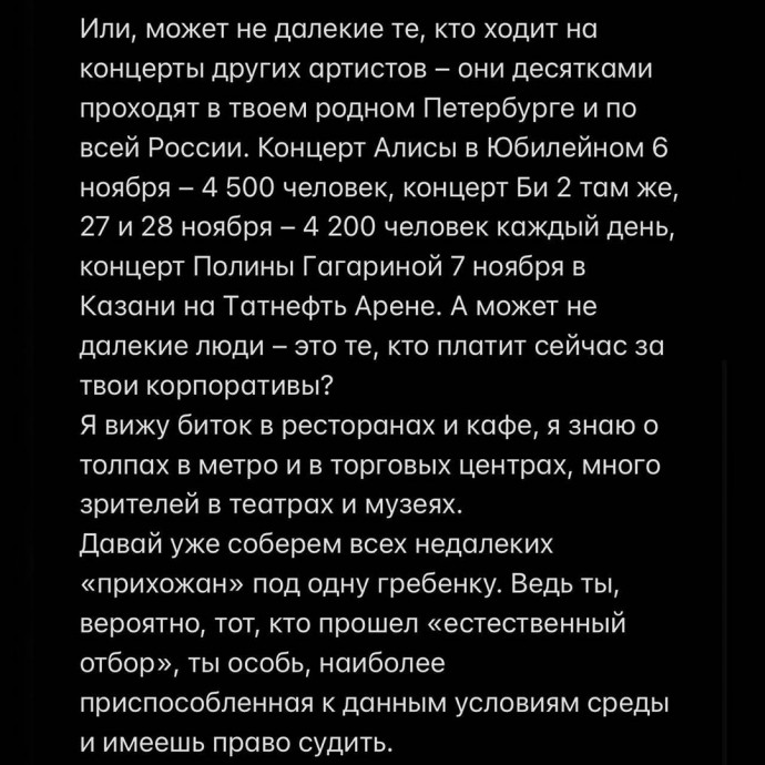 Ответ Басты не заставил себя долго ждать. Артист привел оппоненту примеры других концертов, которые проходят несмотря на пандемию, а также очереди в метро и футбольные матчи.
