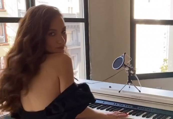 Вот и в этот раз, она вроде бы просто играла на фортепиано, но только у её платья оказался такой фасон, что, едва подняв руки, Вика сразу засветила обнаженную грудь.