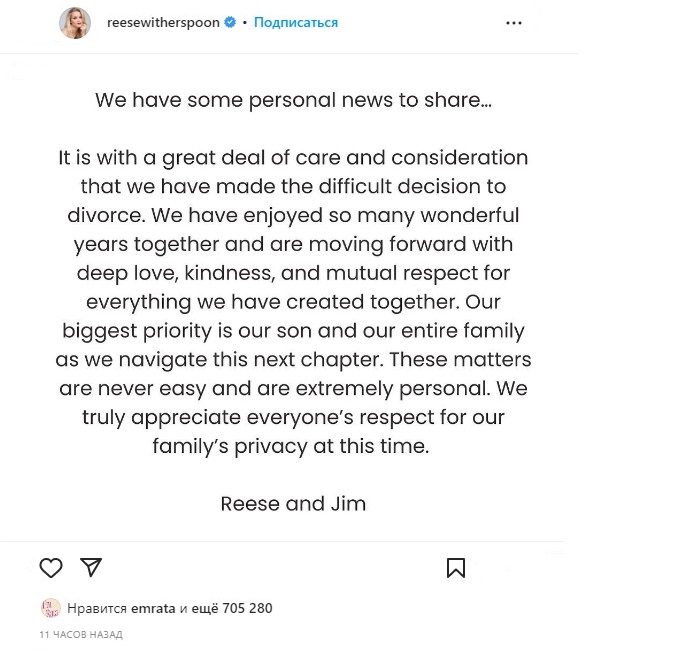 Но это было тогда, а сейчас там появились совсем другие слова, которые сообщили о том, что они с Джимом расстаются без скандалов, остаются друзьями и продолжают вместе воспитывать своего 11-летнего сына.
