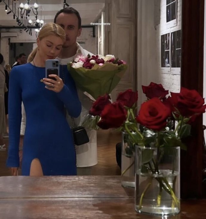 На снимке Юлианна красовалась в синем платье с вырезом до бедра, в то время как ее супруг Андрей предстал в рубашке белого цвета и синих брюках.
